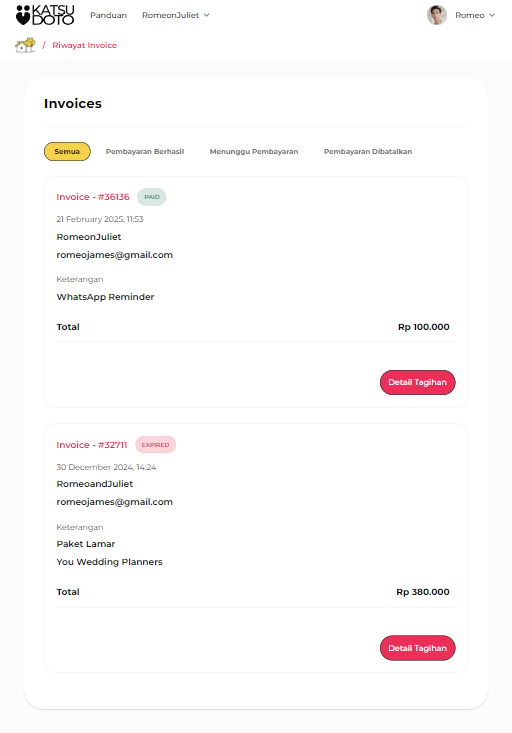 Klik tombol **Detail Tagihan** untuk melihat invoice pemesanmu.